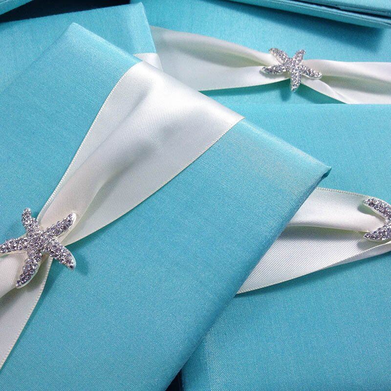 The beach party or beach wedding event starts just more luxury with this cute wedding invitation folder featuring silk and starfish brooch.