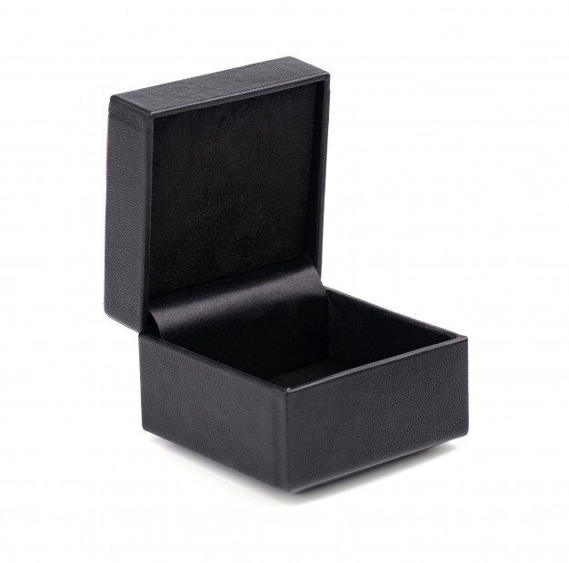 Elegant matte leatherette paper jewelry box perfect for gifts and favors. Square-shaped with a hinged lid, available with custom foil-stamped logo inside, outside, or both. Interior options include standard paper or custom designs like laser-cut foam or ring holders.
