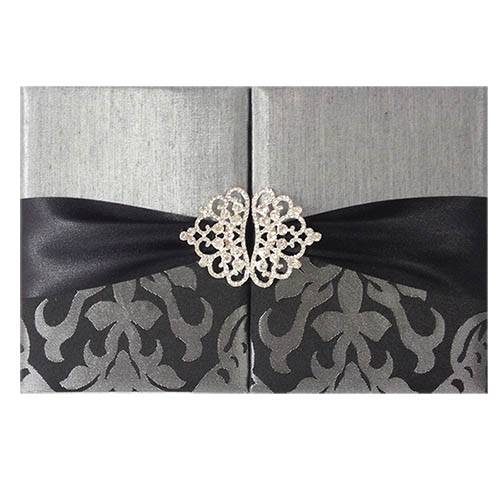 Luxury folio invitation featuring brocade silk with padded exterior, adorned with a silver plated crown brooch on black satin ribbon. Elegant pocket and ribbon holders inside for a sophisticated presentation.