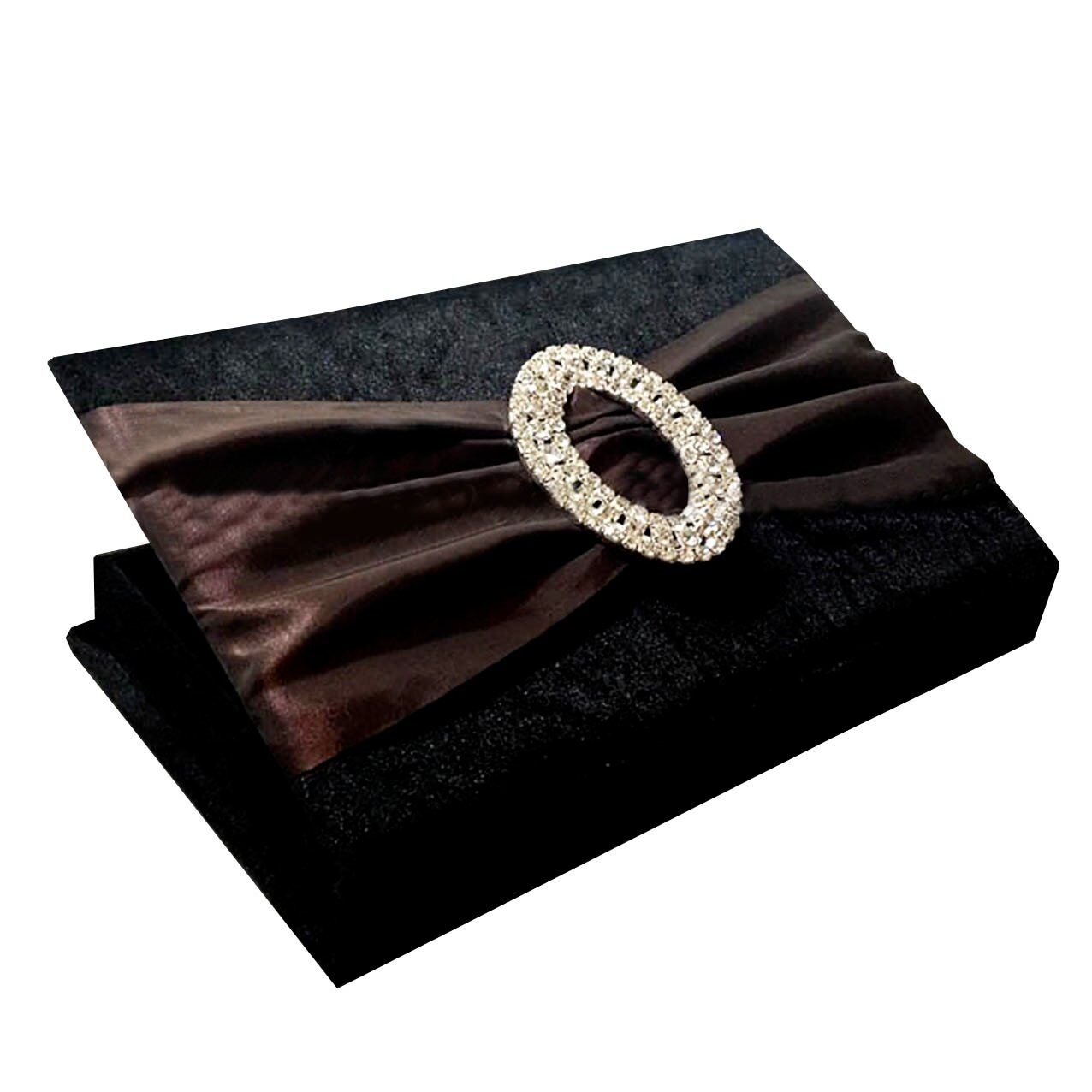 Luxury black velvet invitation box with oval rhinestone crystal buckle used for wedding, gala and anniversary invitation cards. Order in featured or custom size and color