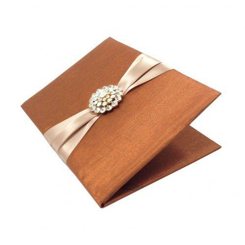 Elegant Bronze Silk Folio Invitation - Perfect for weddings and formal events, this luxurious padded folio features a beautiful bridal satin ribbon with rhinestone crystal brooch closure. Inside includes a silk holder for invitations and a pocket for RSVP cards or menu options.