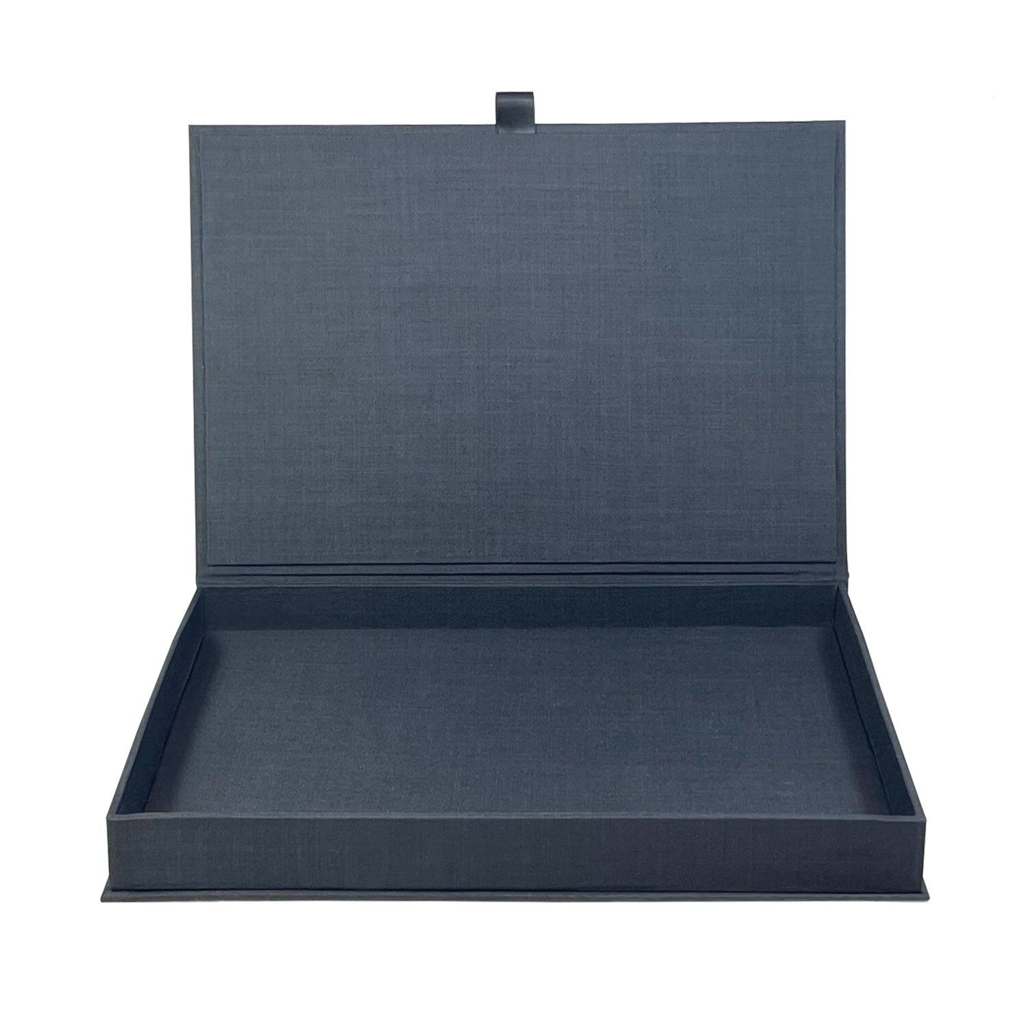 Our elegant Linen Photo Box features a hinged lid with ribbon pull, perfect for storing photos or documents.
