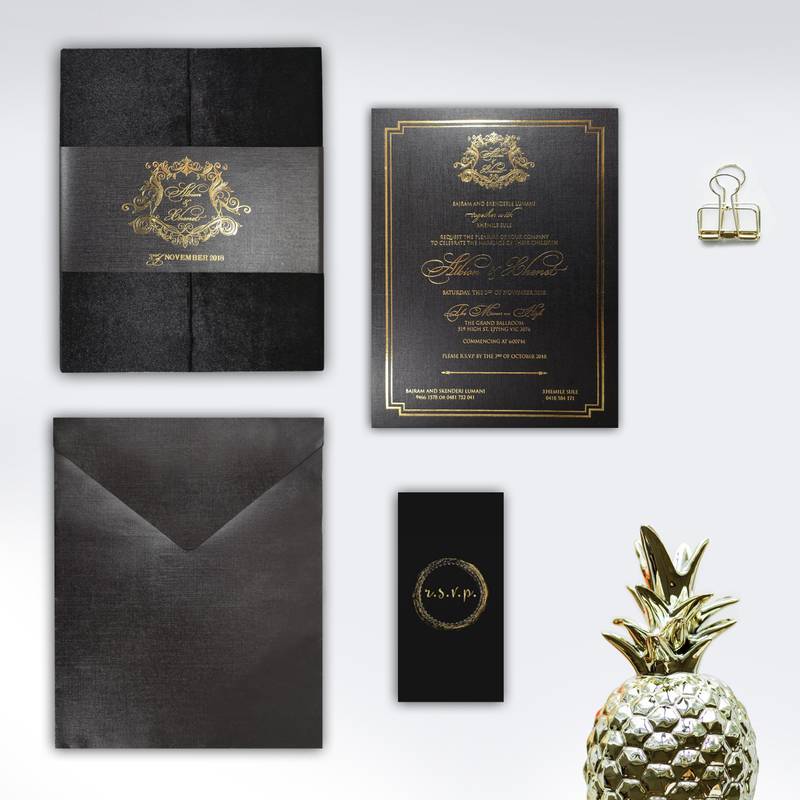 Color: Black with gold foil (ivory with silver foil also available)