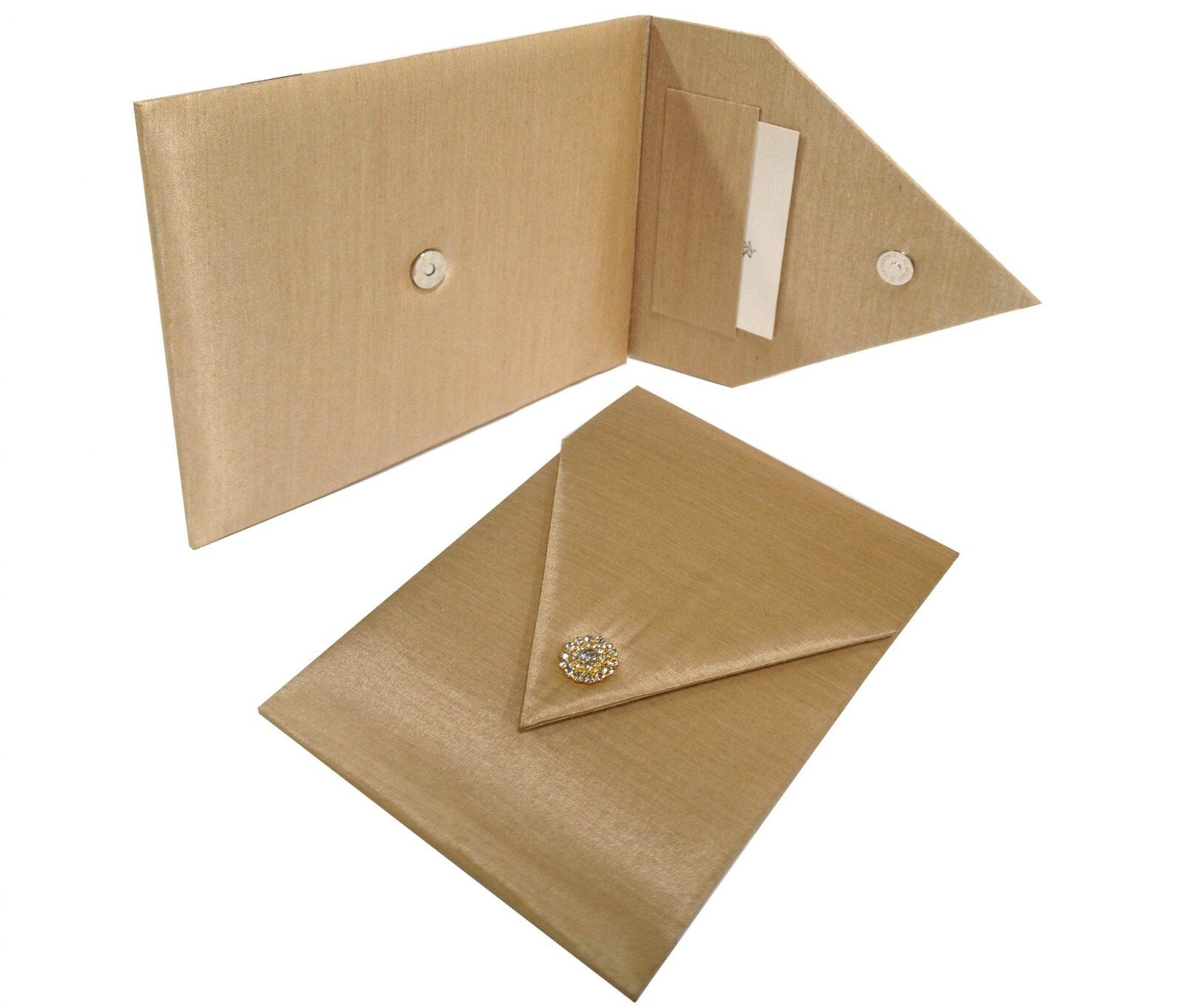 Luxurious silk wedding envelope with elegant rhinestone embellishment and magnetic closure, perfect for invitations or premium packaging.