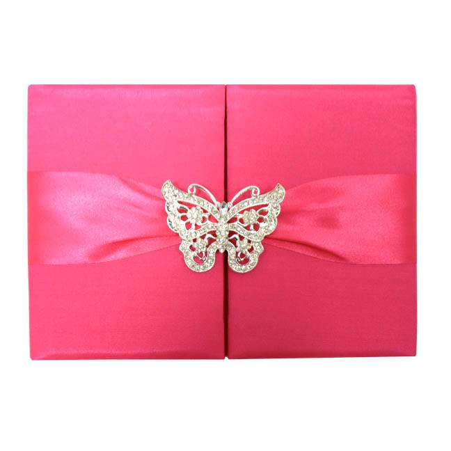 Elegant Pink Invitation Folio with butterfly clasp, perfect for baby showers, birthdays, and weddings. This luxurious padded silk folio features interior pockets for invitation, RSVP cards, and menu options. The eye-catching deep pink color ensures your invitation will be prominently displayed, keeping your event top-of-mind for guests.
