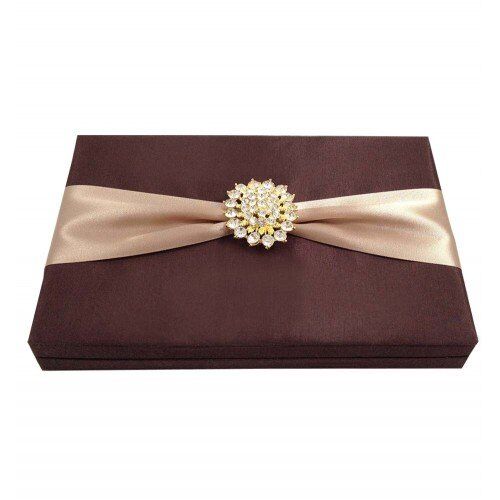 Luxurious chocolate brown wedding invitation box featuring a stunning gold plated crystal brooch with real rhinestone crystals. Elegantly designed with padding inside and out, plus a ribbon holder for wedding cards in the inner lid.
