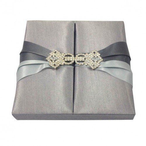 Embellished silver faux silk invitation box with two doors + metal clasp embellishment