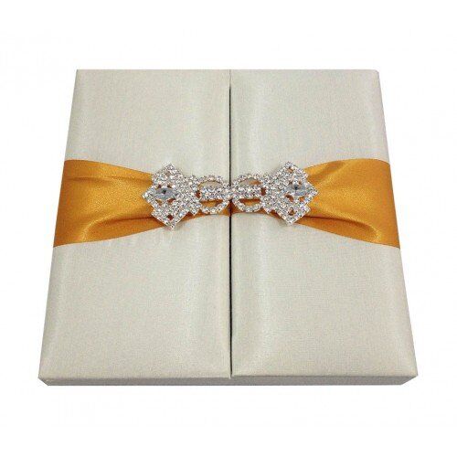 Embellished ivory and gold themed wedding invitation box, covered with silk.