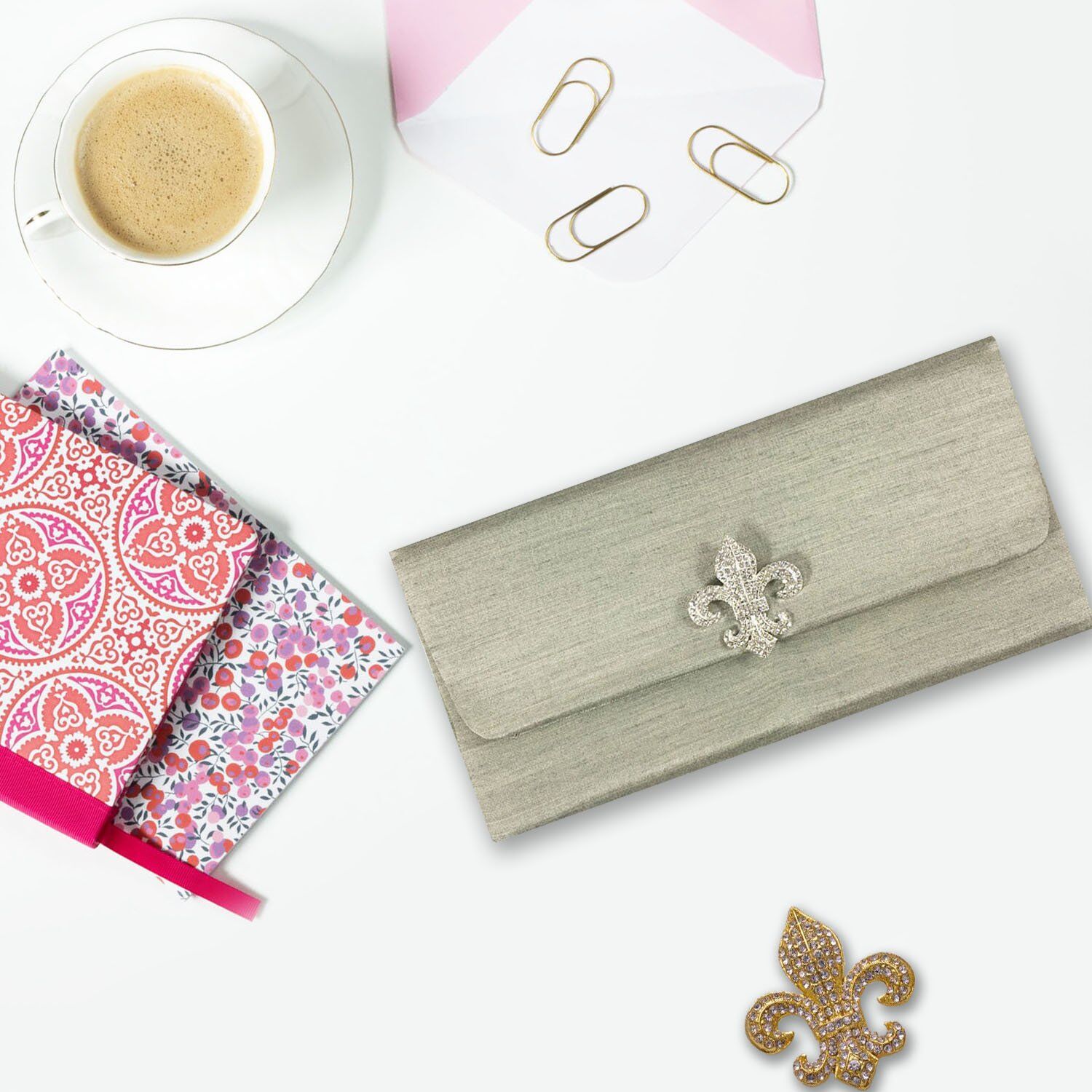 Luxury envelope for wedding and event invitations with fleur de lis brooch, magnetic closure, and padded silk exterior. Perfect for premium invitations and special occasions. This high-quality handmade design measures 4×9 inches.