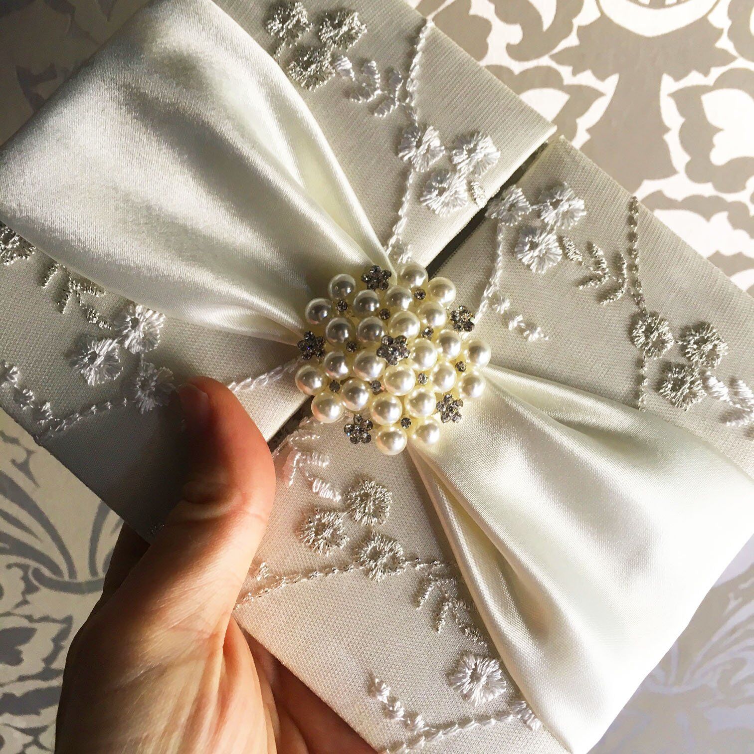 Pearl-Adorned Ivory Silk Folio Wedding Invitation with Lace Detail