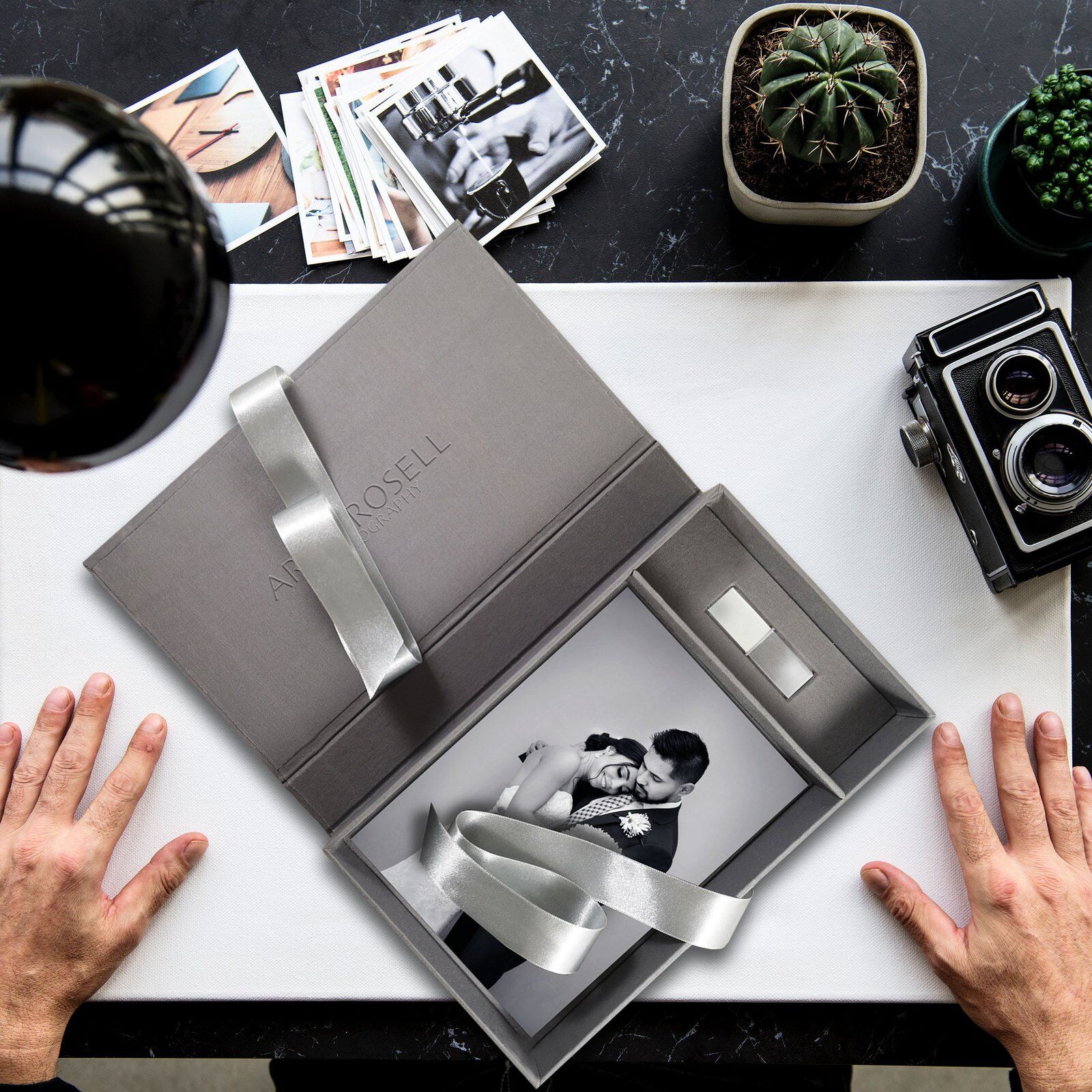 This sleek grey linen box elegantly stores USB drives and digital devices, featuring a dedicated photo compartment, crafted by Invitations Kart.