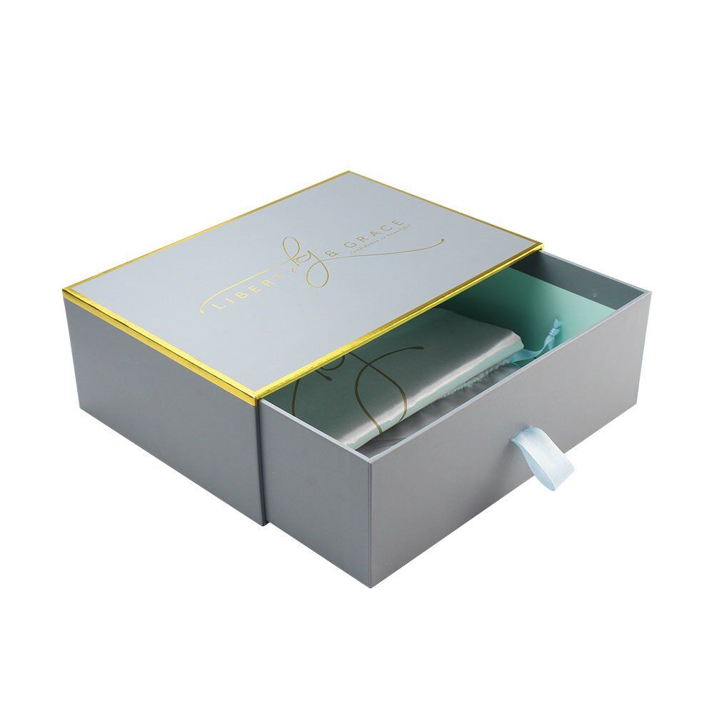 Quality sturdy cardboard sliding packaging box, featured in matte grey with gold foil design graphic added onto the box top. We manufacture and supply high quality high-end packaging boxes since 2006.