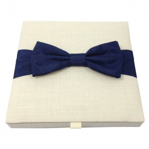 Modern hand-made linen box featuring navy blue man bow + ribbon embellishment with hinged lid opening