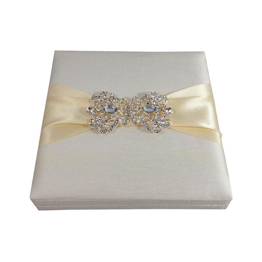 Elevate your special day with our handcrafted dupioni silk wedding invitation box. This luxurious padded design features an elegant diamante rhinestone brooch and convenient pocket holder for RSVP cards.