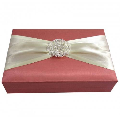 Elevate your wedding with our luxurious dusty pink padded invitation box. Featuring a stunning rhinestone brooch and wide ribbon bow, this hinged-lid box offers elegant storage for your wedding cards with a ribbon holder inside for additional items.