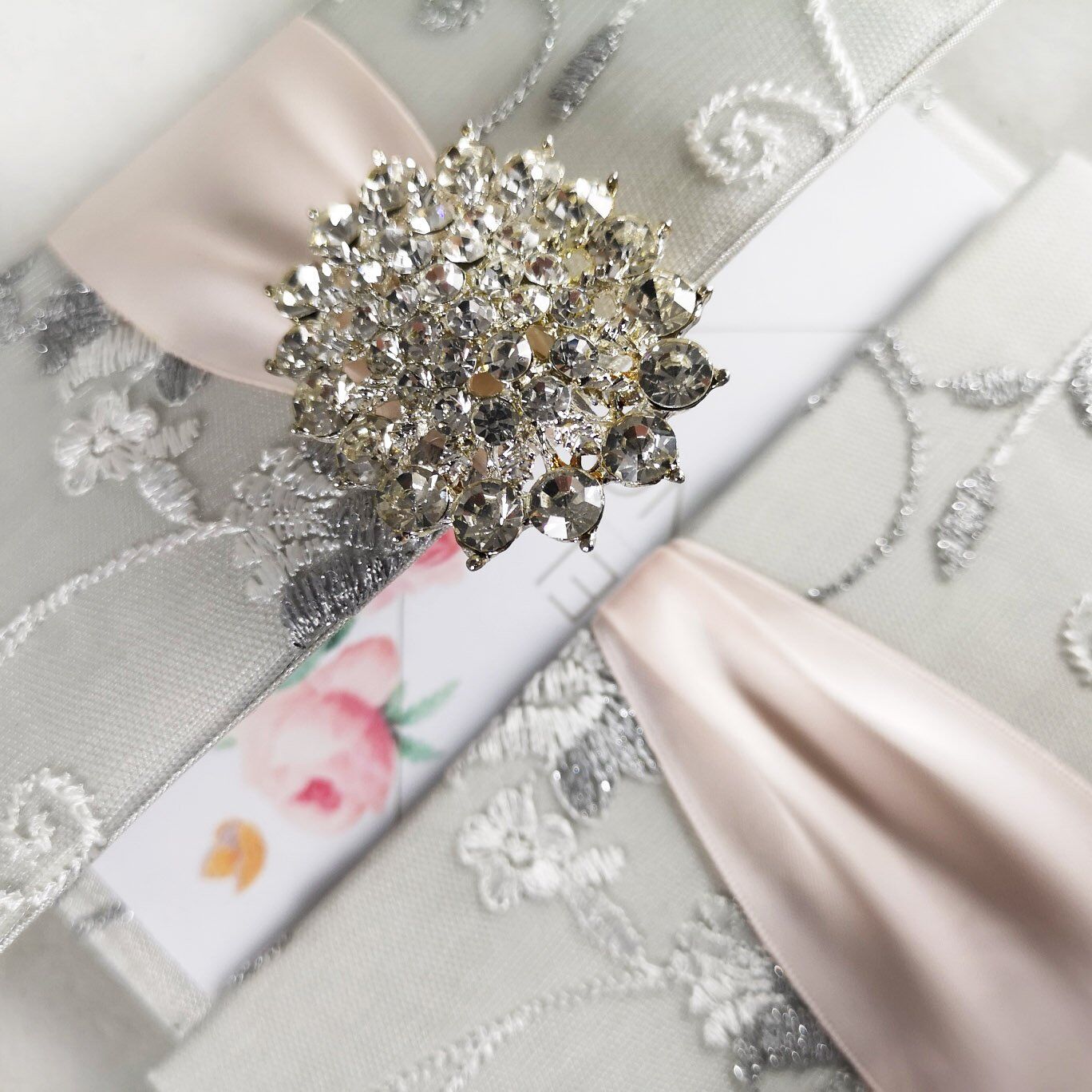 This elegant ivory brocade invitation folio features a decorative brooch and ribbon, offering a luxurious presentation for your wedding announcements.