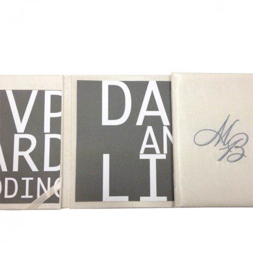 This luxury wedding invitation folder features a double-fold design with padded exterior and elegant embroidered monogram. Perfect for creating sophisticated invitations for your special day.