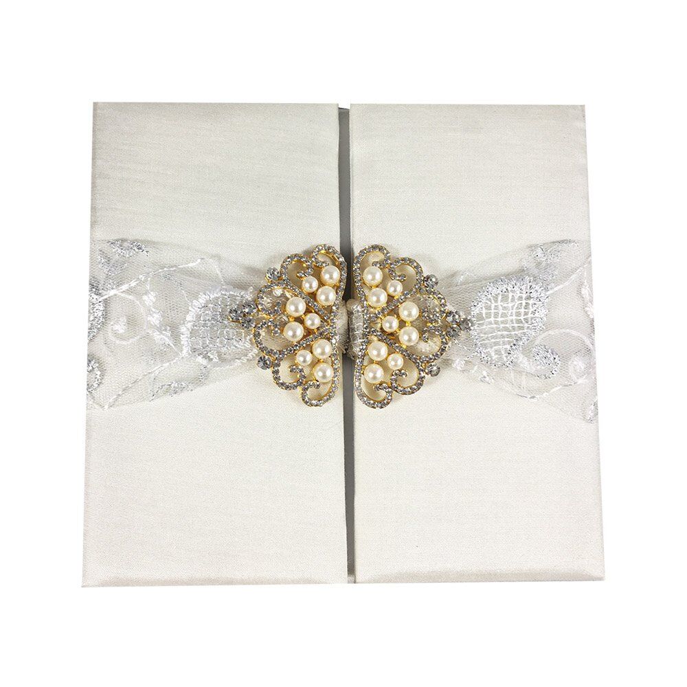 Pearlescent Crown Ivory Folio Invitation with Regal Lace Embellishment