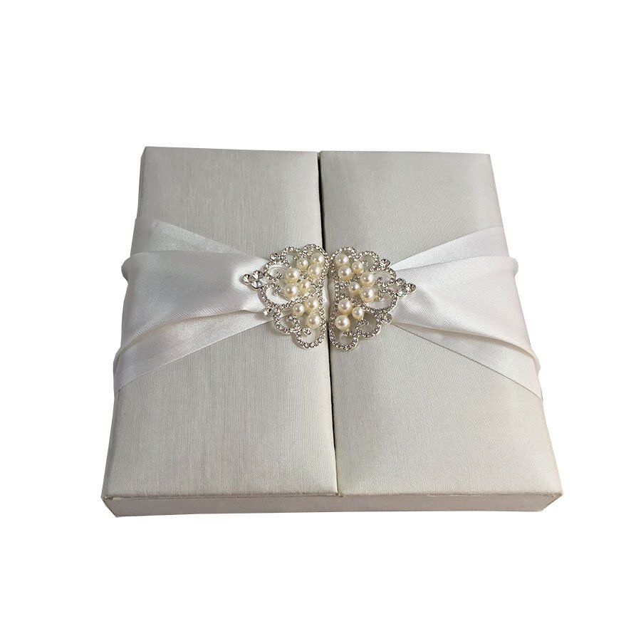 What's Included: Gatefold box with embellishment, fully covered in pure silk, padded interior and exterior, 4-inch wide ribbon adorned with silver plated rhinestone crystal and pearl crown brooches. Features pockets behind each gate and a center ribbon holder.