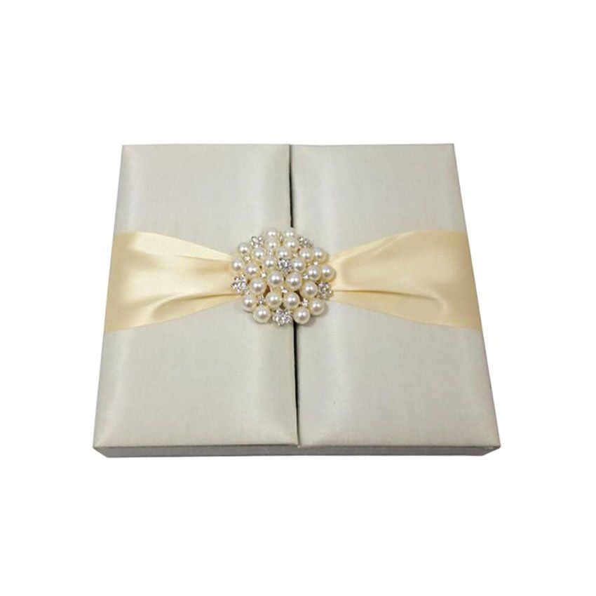 Luxury Ivory Silk Wedding Invitation Box with Pearl Brooch