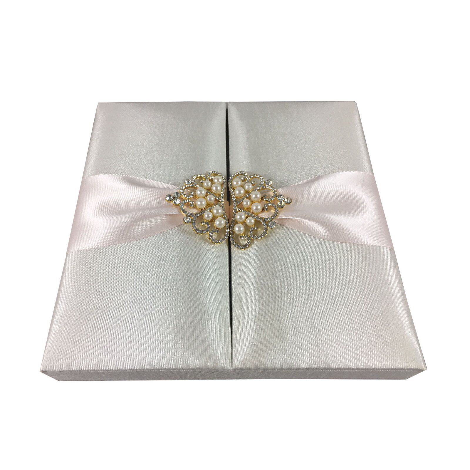 Luxurious handmade couture invitation boxes, elegantly designed with silk padding and embellished with a crown pearl brooch. Perfect for weddings, galas, and special events that leave a lasting impression.