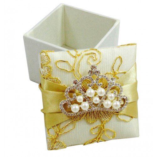 Elevate your wedding with our luxury silk favor box, adorned with a stunning silver-plated pearl crown brooch on a golden lace-covered lid.