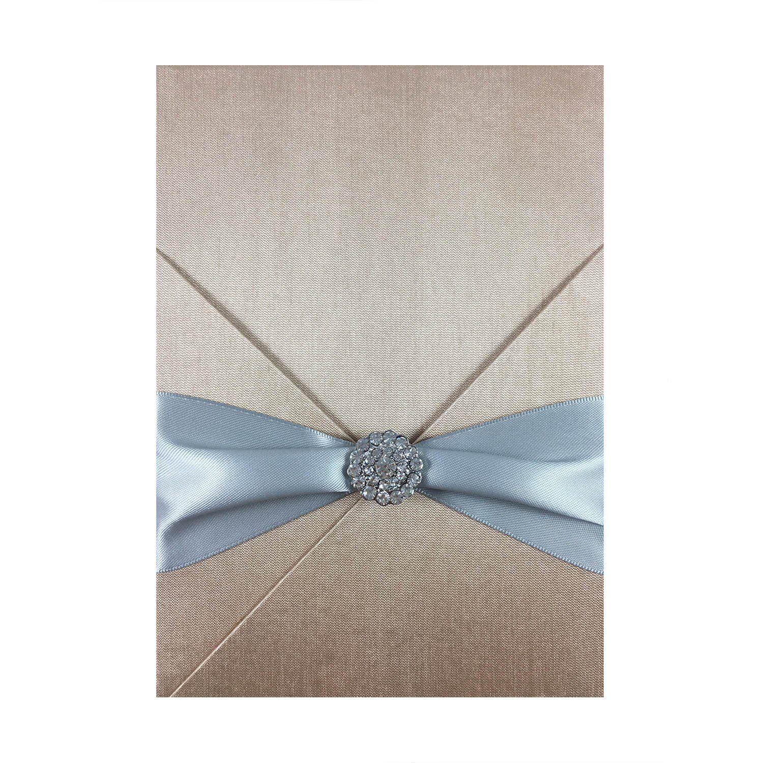 Luxury Wedding Card with a champagne dupioni silk finish and silver plated rhinestone button. Perfect for wedding invitations, menu cards, and event announcements. Each card is handcrafted for a premium look.