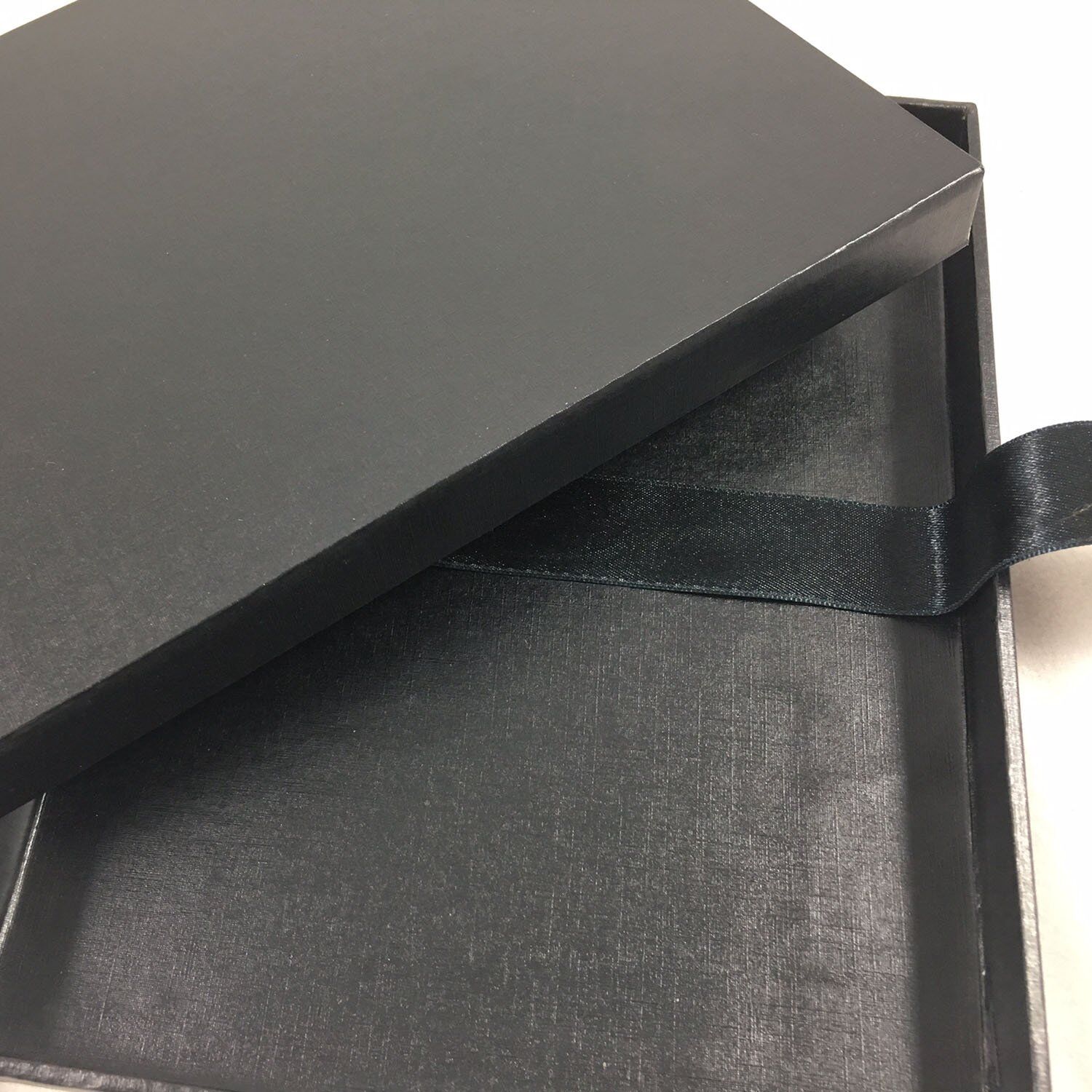 Elegant mailing box designed for luxury invitations, wedding boxes, and portfolios. Our boxes feature a ribbon tongue for easy removal of contents and can be customized to your specifications.