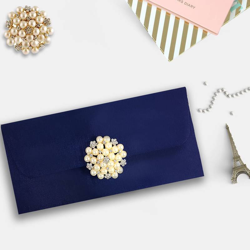 Luxury wedding envelope made from cardboard covered with fine silk fabric, embellished with a pearl brooch and magnetic lock. Interior lined with silk for an elegant look. Perfect for weddings, events, baby showers, and party invitations. Available in various colors and customization options.