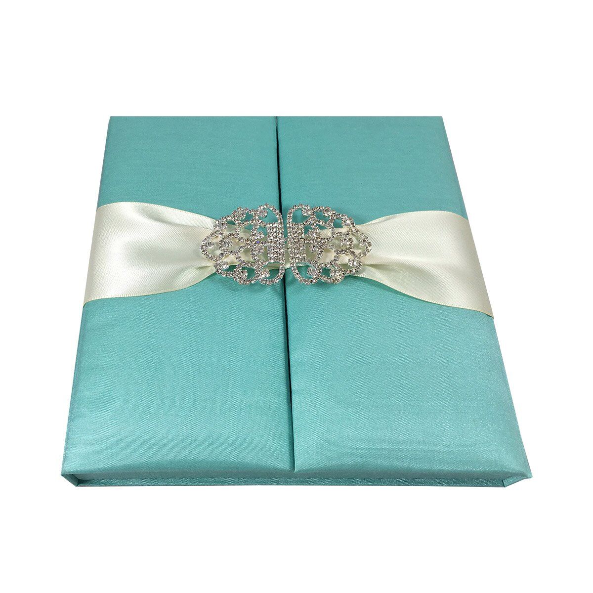 Elegant silk box designed for invitation cards featuring a rhinestone clasp, ribbon corner holder for invitation on padded bottom, and extra pocket behind doors. Hand-crafted with luxurious appeal.