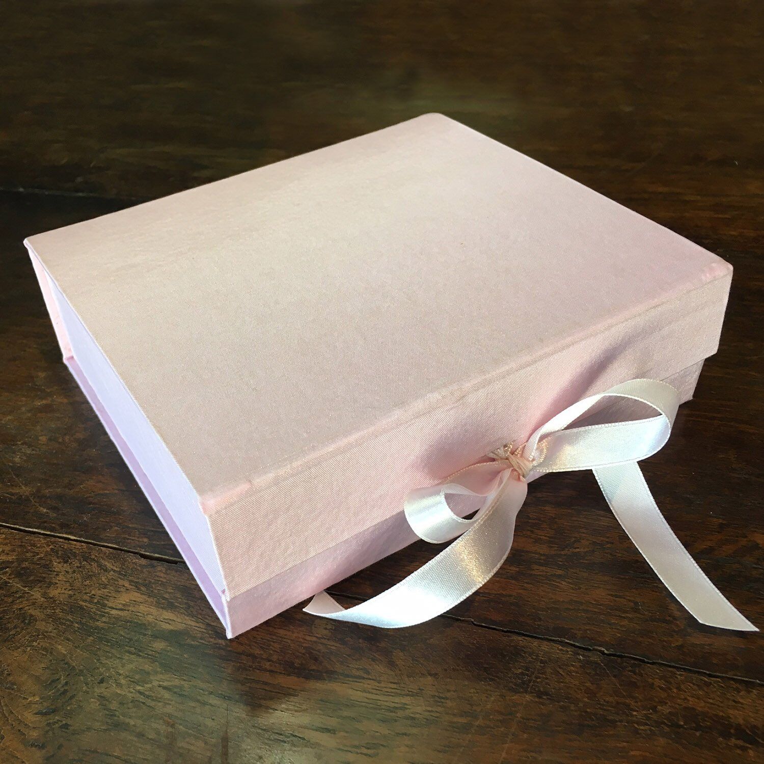 Elegant pink hinged lid silk box with sturdy cardboard, perfect for displaying photo albums, jewelry, or wedding invitations. Customize with gold, silver, or rosegold foil stamping. Optional inner compartments, padding, or pocket holders available.