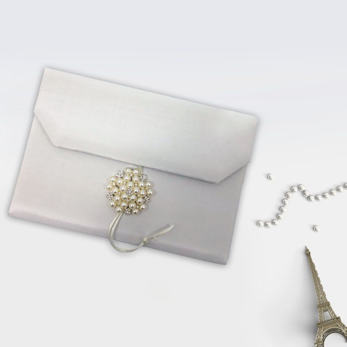 What's Included: Silk envelope with pearl brooch and satin string closure