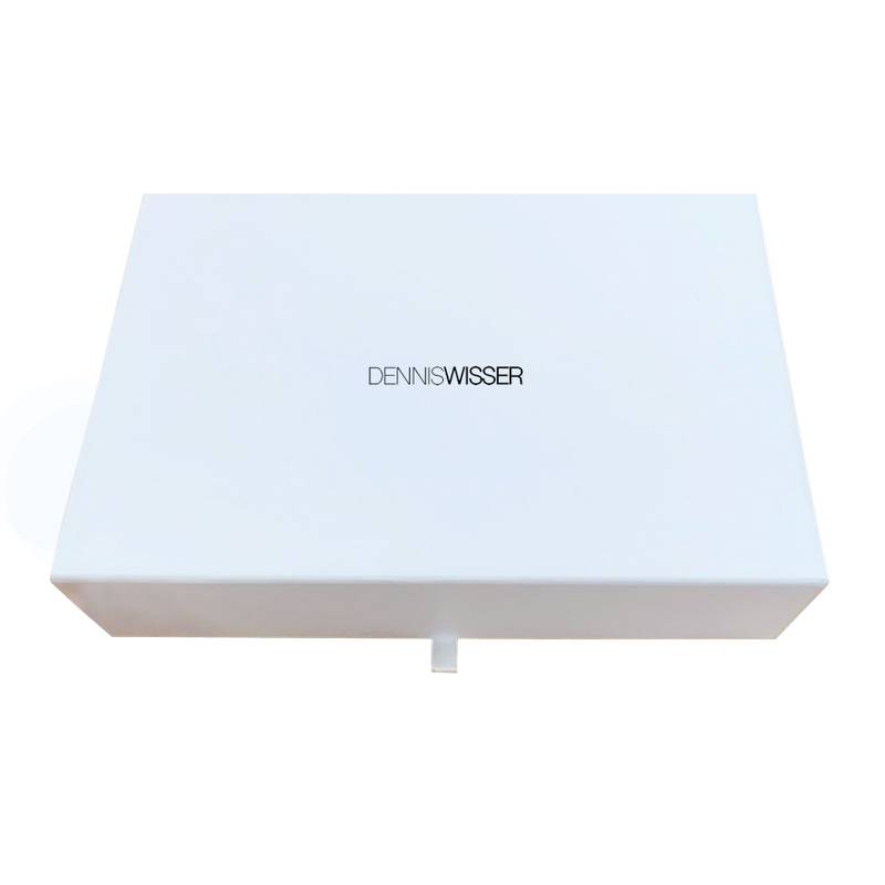 Matte white folding box with magnet closure and black logo print.