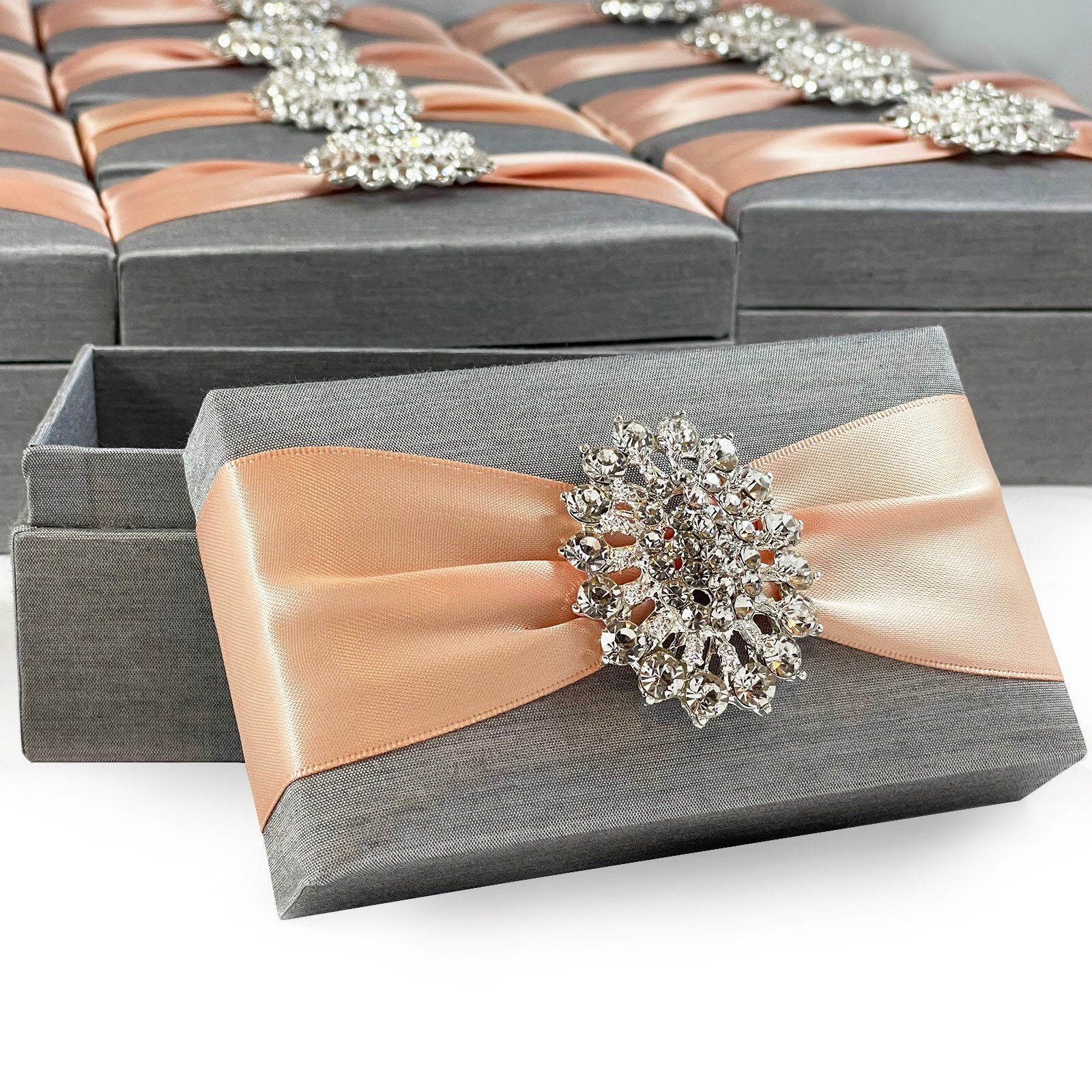 Luxurious rectangle favor box with silver plated rhinestone brooch on double-faced satin silk ribbon. Perfect for wedding favors, gifts, or jewelry packaging. Custom options available for size, color, and interior features like removable pillows or foam inlays.