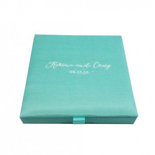 Elegant aqua blue wedding invitation box with custom embroidery for bride and groom names plus wedding date. Perfect keepsake for your special occasion!