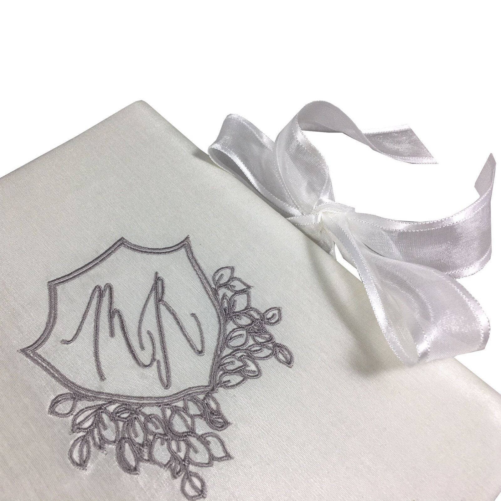 - What's Included: Padded pocket folder with monogram embroidery, pocket holder, corner card holder, and organza ribbon bow closure