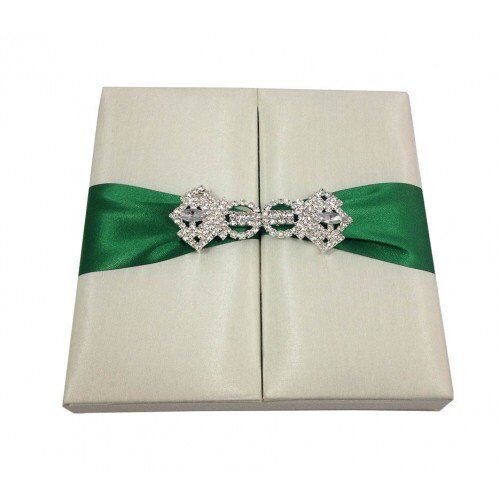 Ivory silk and green satin ribbon turned this wedding box into something unique