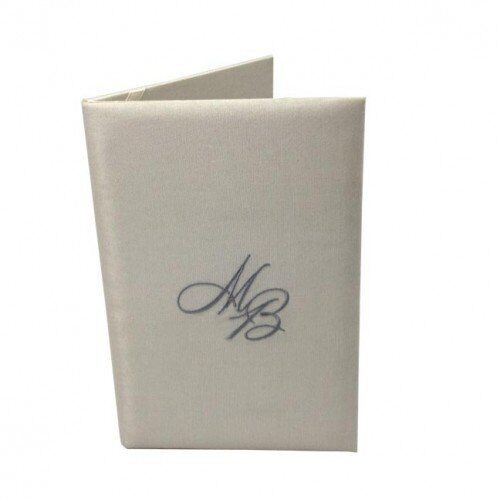 Book fold silk folio in ivory with your customized monogram embroidery (shown here with silver thread)