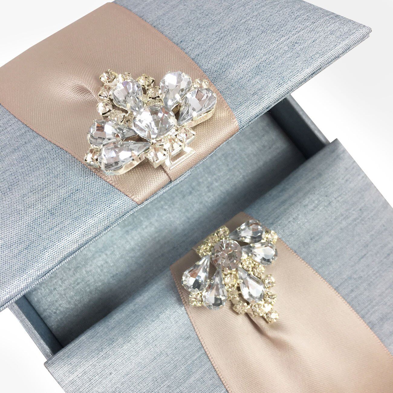 This elegant boxed custom invitation features a stylish silver diamond clasp with rhinestones, padded interior and exterior, and a pocket holder.