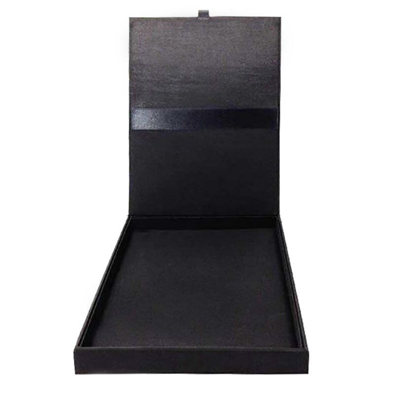 Elegant padded wedding invitation box with hinged lid featuring ribbon holder. Inner bottom is nicely padded for luxury feel. Perfect for invitation cards, jewelry, or gifts. Custom options available for a sophisticated presentation.