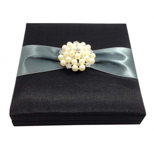 Elevate your invitations with our premium hinged lid silk box. Crafted with attention to detail, featuring black silk, gray ribbon, and elegant pearl brooch embellishment. Perfect for weddings, social events, and corporate functions.