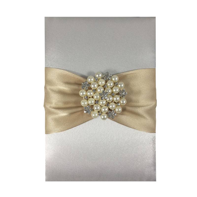 Luxury silk invitation card featuring pearl brooch and light gold sash on off-white satin silk background. Perfect for weddings and special events. Also suitable for menu cards and table cards.