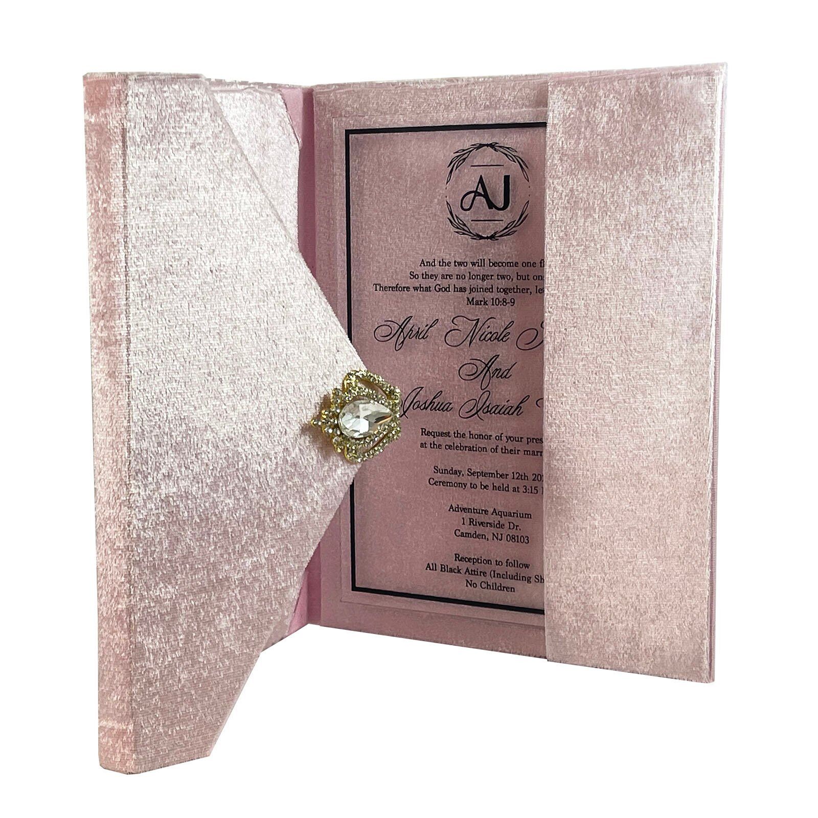 Handmade hardcover pocket fold envelope, covered with premium quality velvet fabric. Embellished with rhinestone crown brooch. You can buy luxurious custom invitations,