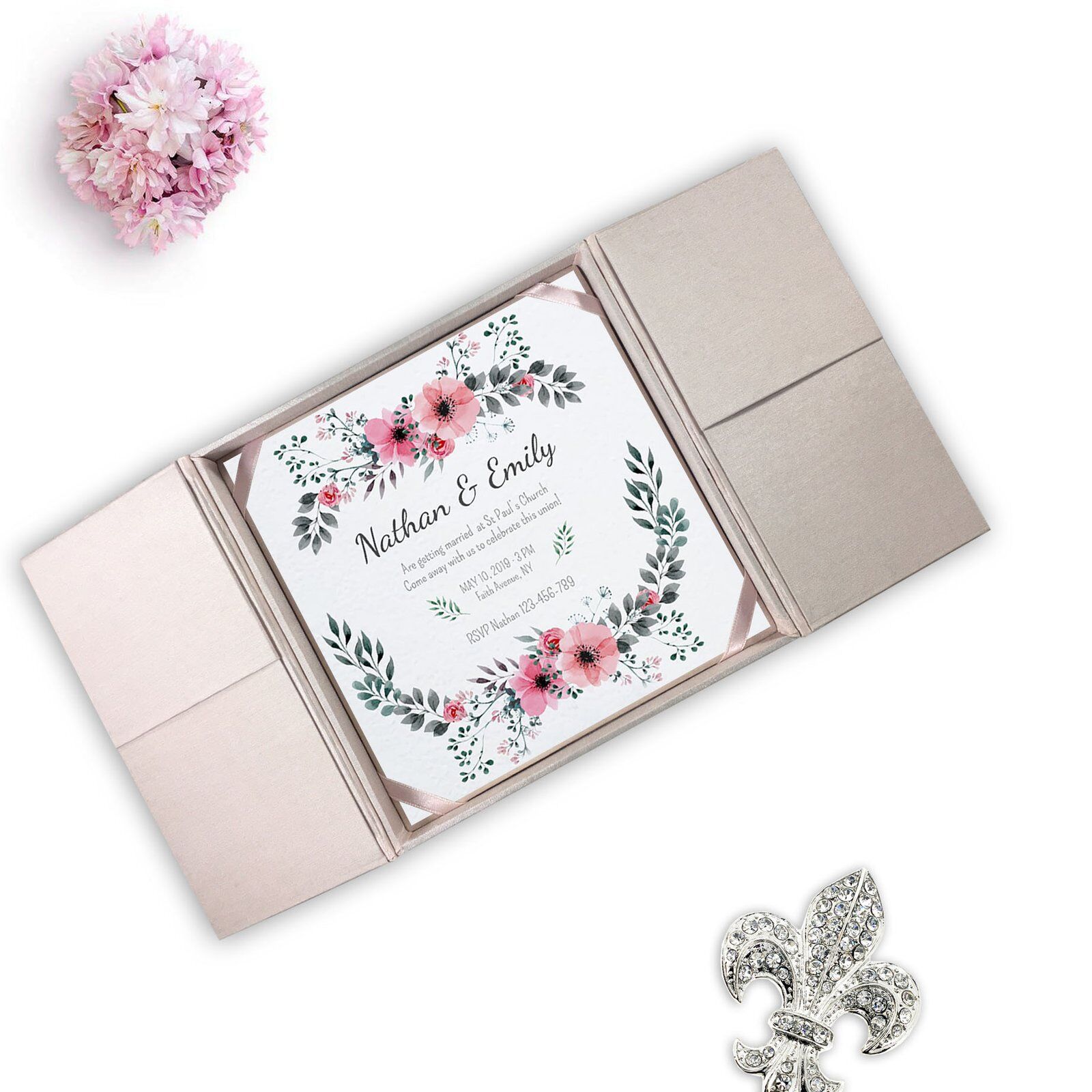 Elegant blush pink silk invitation box, classic design with padded exterior and interior. Features pocket holder for envelopes and ribbon holder for main invitation card. Perfect for wedding invitations with a luxurious touch.