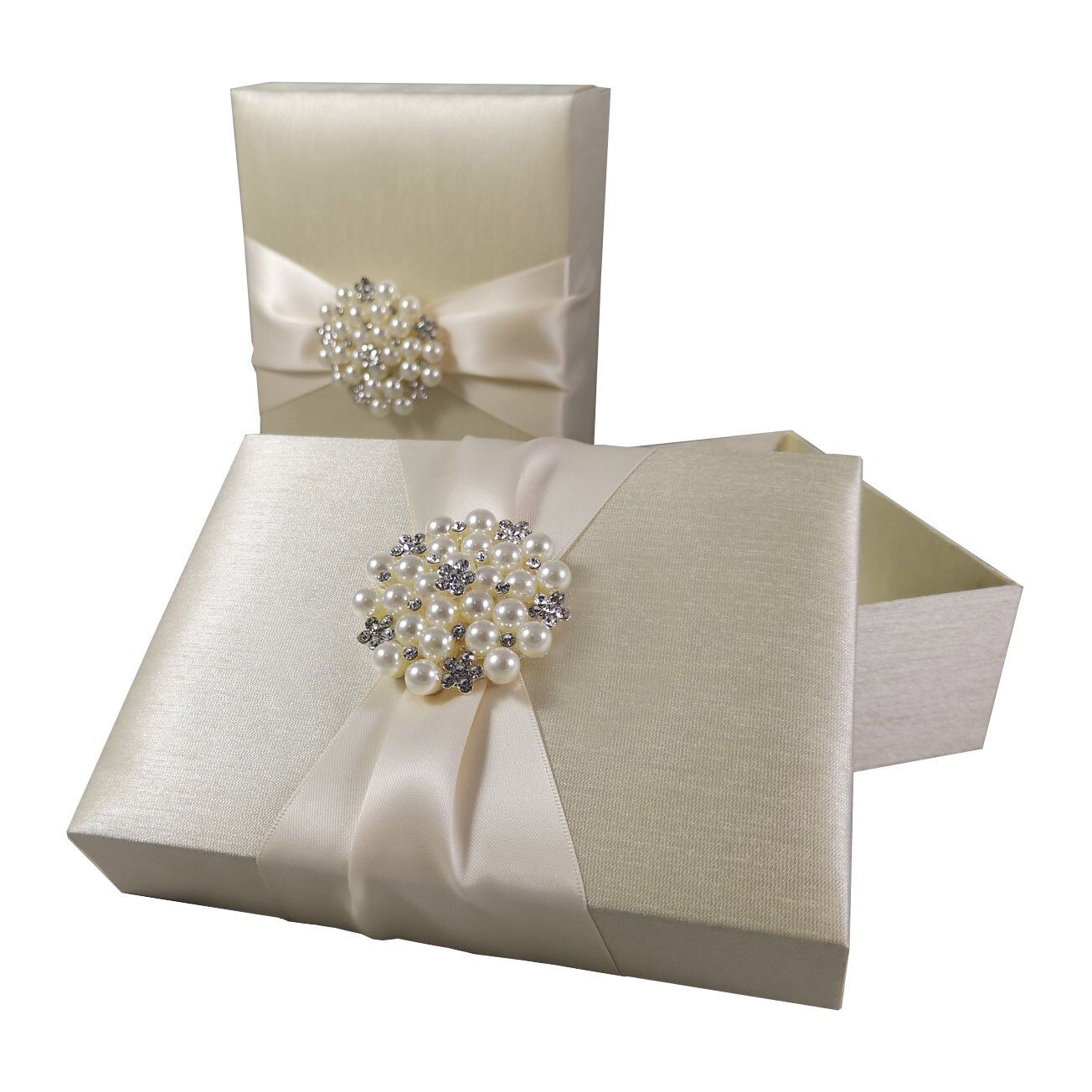 Elegant embellished wedding box with large pearl brooch. Features padded lid, padded interior, and 3-inch wide double faced satin ribbon. Perfect for events, jewelry packaging, crystal masks, champagne bottles, or luxury ornaments.