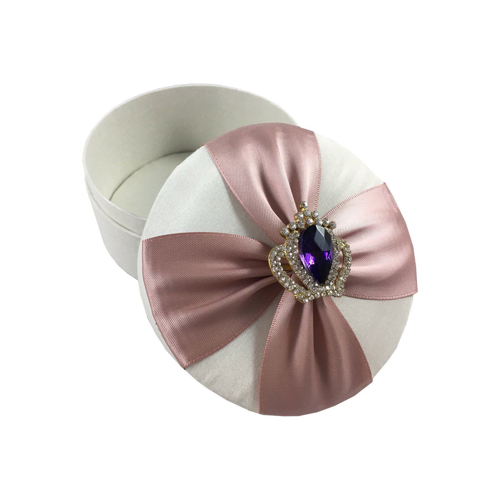 - What's Included: Round box with padded lid and interior bottom, decorative rhinestone brooch