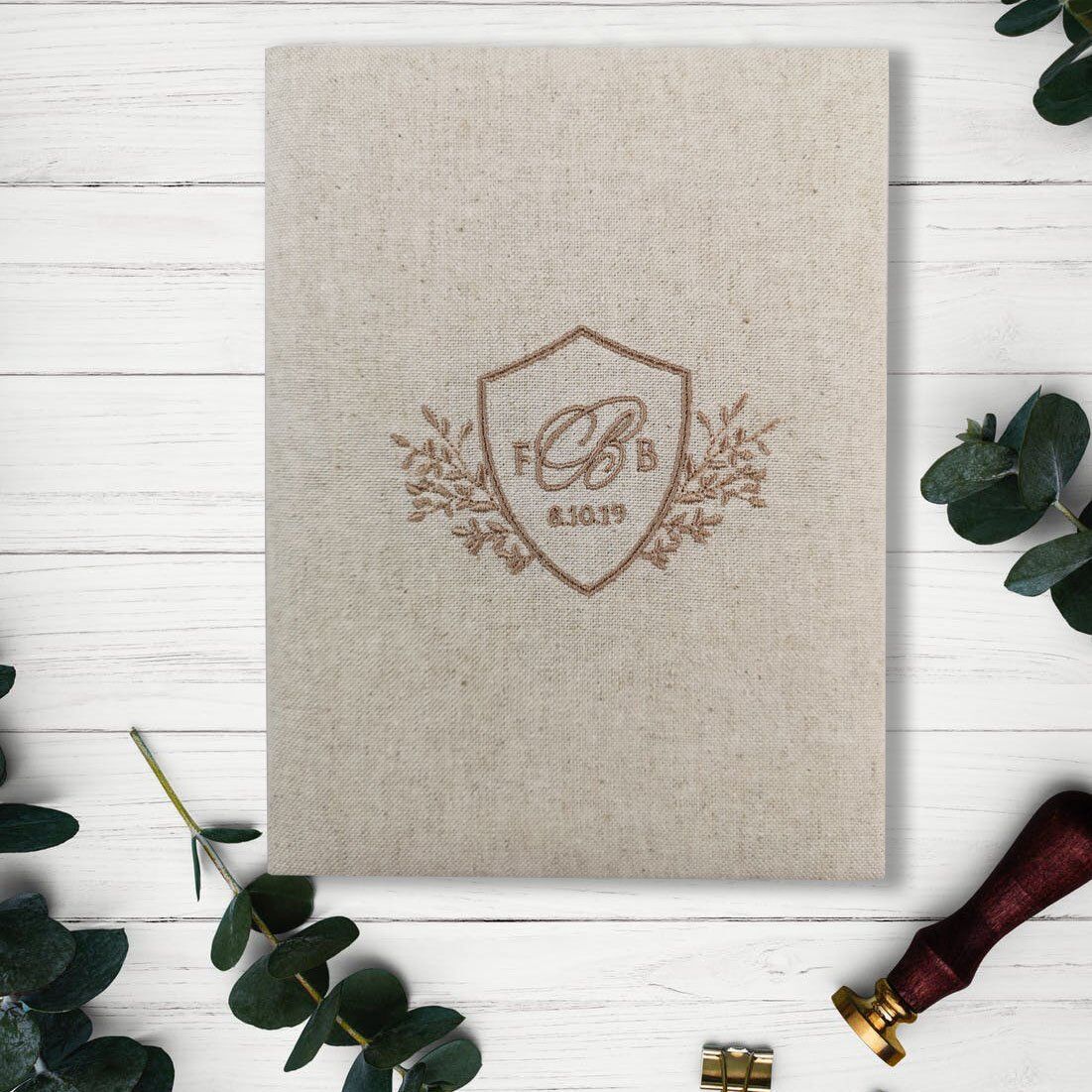 • What's Included: Linen folder with pocket, card holder, and custom monogram embroidery