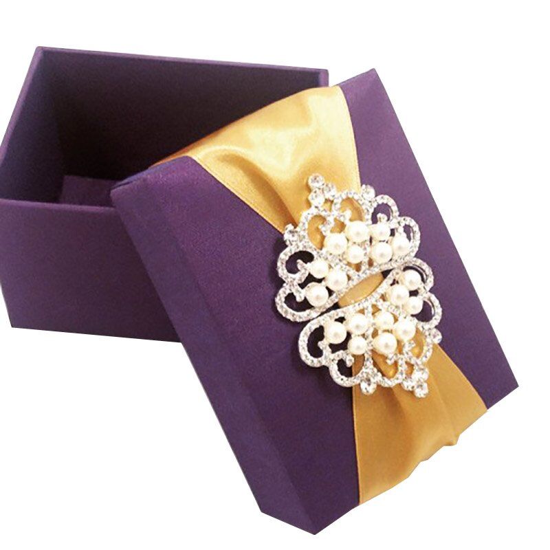 Luxurious pearl crown brooch embellished purple silk favor box for wedding and events