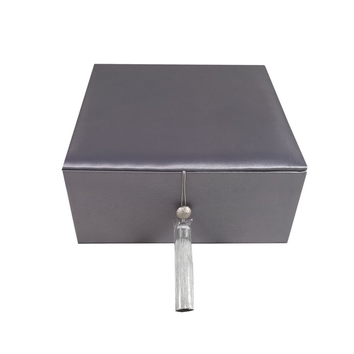 This premium silver gift box features a luxurious silk finish and elegant tassel closure. Adorned with a custom monogram, it offers sophisticated packaging for high-end presents. Handcrafted with padded hinged lid for superior quality.