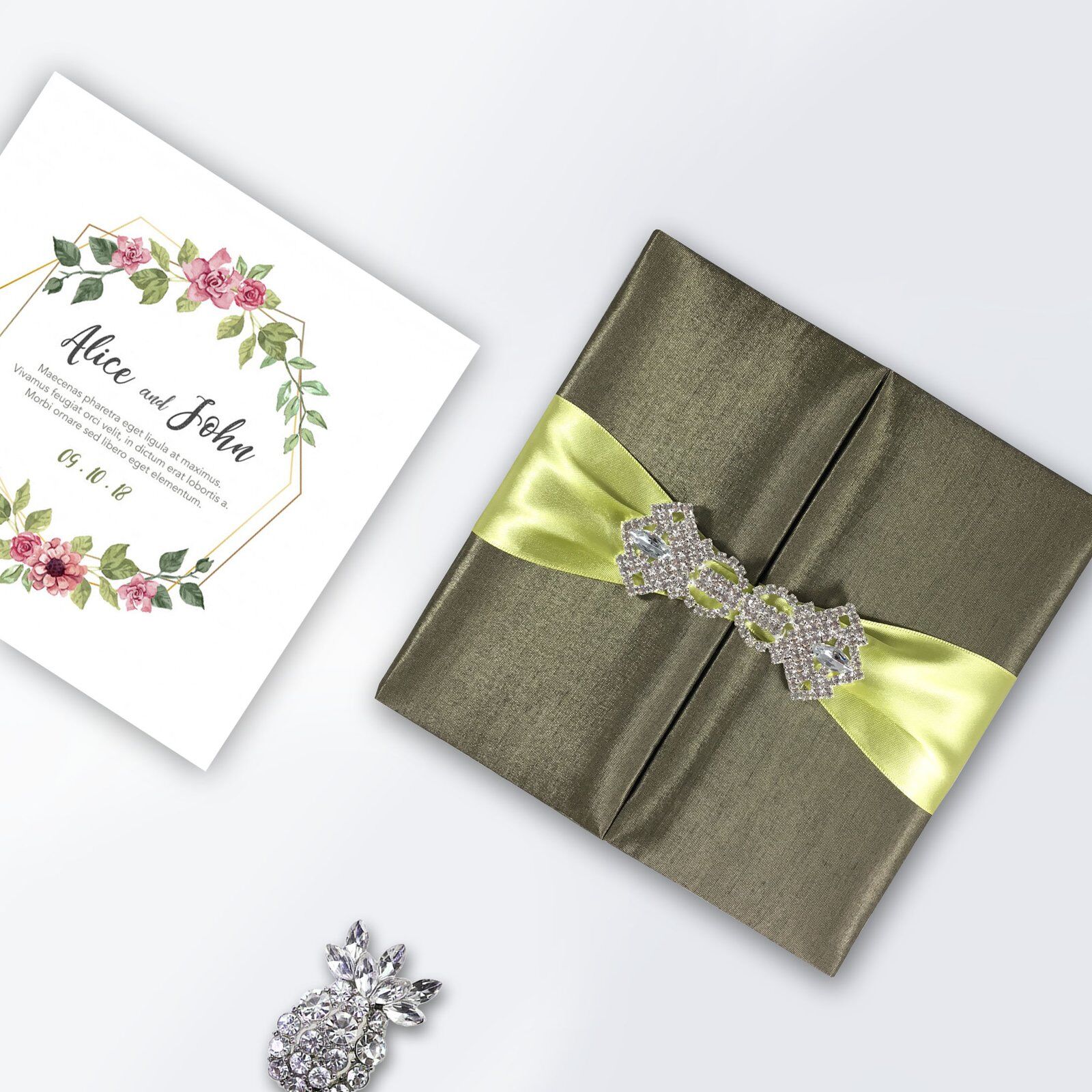 Looking for uniform green and chartreuse invitations? We have designed this breath taking silk invitation box with large rhinestone brooch for you invitation cards. Stylish, unique and original